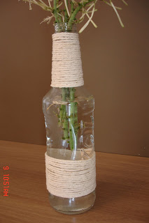 Para evitar que as garrafas fossem parar no lixeiro, resolvi dar uma enfeitadinha e usá-las como vaso para arranjo de mesa. Bastou passar na garrafa um pouco de cola branca e enrolar o barbante rústico nela. Miçangas ou fitas também dariam um efeito bem legal.