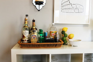 A nossa bandeja de todo dia tem mais funções do que simplesmente servir café ou chá. No aparador-bar pode acomodar garrafas,vasinhos com flores e copos. Faz também as vezes de centro de mesa bem diferente, com um belo e singelo arranjo floral.