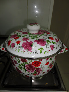 Meninas do céu, eu que nem sou chegada às artes culinárias, me debulhei em amores por essa panelinha floral esmaltada, comprada por r$ 35,00 na última viagem que fiz à Cobija.